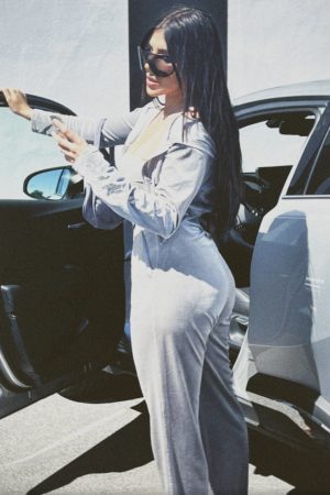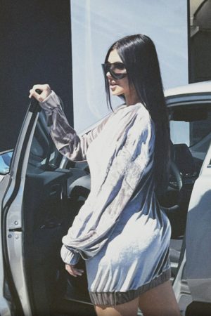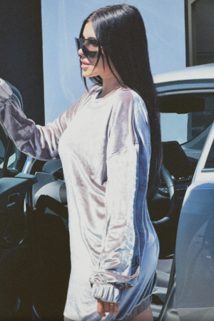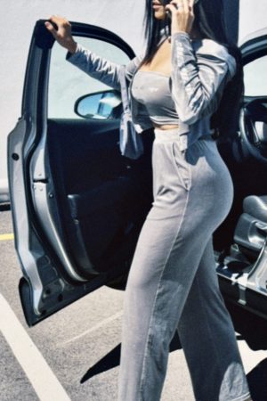 Chaqueta space grey crop de terciopelo con capucha y logo en las mangas.